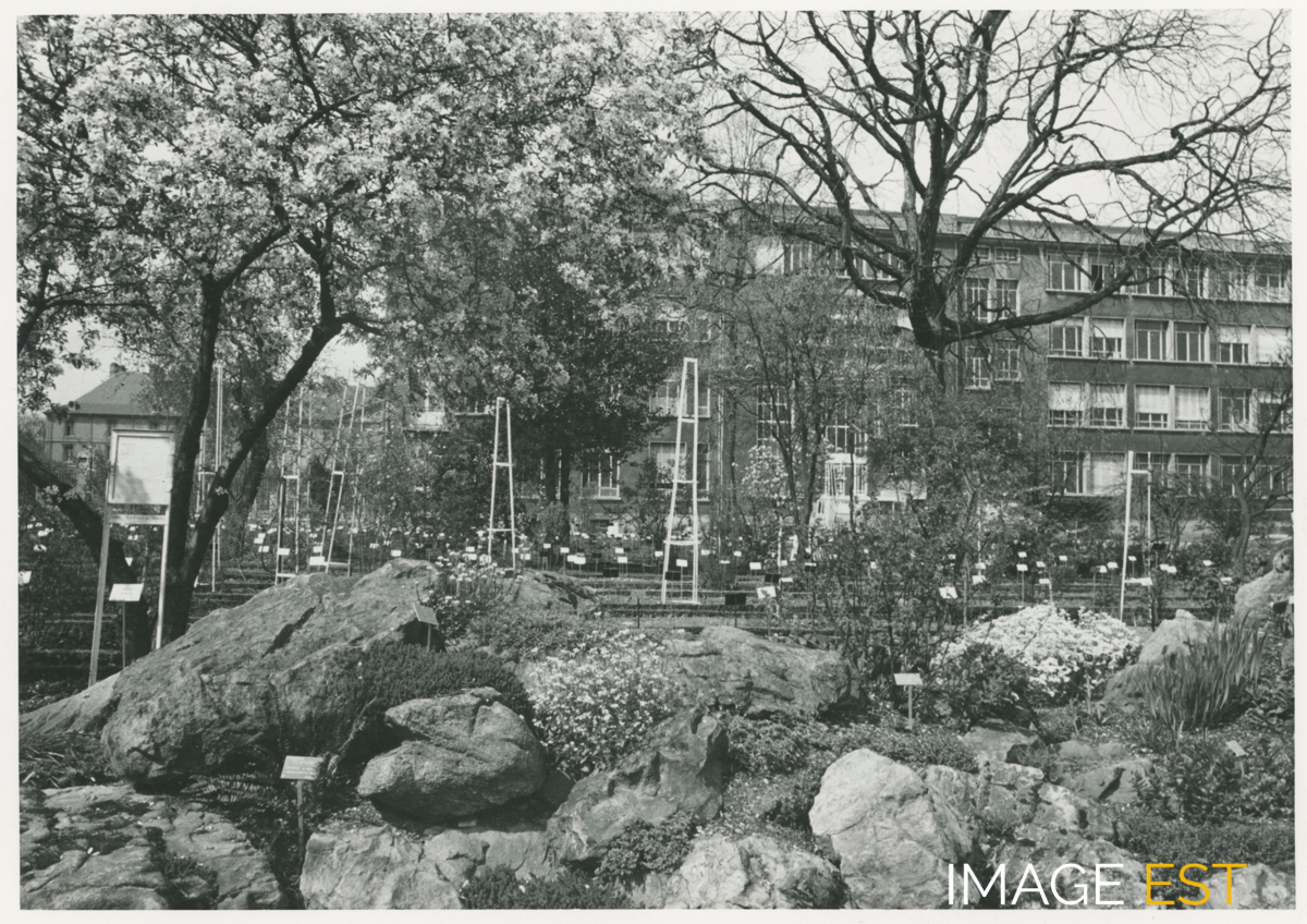 Jardin et bâtiment de l'Ensaia (École nationale supérieure d'agronomie et des industries alimentaires) rue Sainte-Catherine à Nancy (Meurthe-et-Moselle). L'histoire de cette institution remonte à la création successive de trois grandes écoles, l'École de brasserie et de malterie de Nancy (1893), l'Institut colonial et agricole de Nancy (1901) et l'École de laiterie de Nancy (1905). En 1948, l'Institut colonial et agricole de Nancy devient l'École nationale supérieure d'agronomie de Nancy (ENSA). En 1971, les trois grandes écoles (École de brasserie, École de laiterie et Ensa) fusionnent et donnent naissance à l'Ensaia. C'est en 1984 que l'Ensaia quitte ses locaux de la rue Sainte-Catherine à Nancy pour s'installer sur le plateau de Brabois (Source : https://ensaia.univ-lorraine.fr/fr/content/histoire-ensaia).