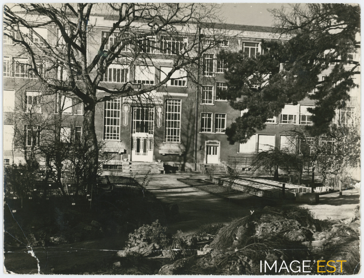 Bâtiment et jardin botanique de l'Ensaia (École nationale supérieure d'agronomie et des industries alimentaires) rue Sainte-Catherine à Nancy (Meurthe-et-Moselle). L'histoire de cette institution remonte à la création successive de trois grandes écoles, l'École de brasserie et de malterie de Nancy (1893), l'Institut colonial et agricole de Nancy (1901) et l'École de laiterie de Nancy (1905). En 1948, l'Institut colonial et agricole de Nancy devient l'École nationale supérieure d'agronomie de Nancy (ENSA). En 1971, les trois grandes écoles (École de brasserie, École de laiterie et Ensa) fusionnent et donnent naissance à l'Ensaia. C'est en 1984 que l'Ensaia quitte ses locaux de la rue Sainte-Catherine à Nancy pour s'installer sur le plateau de Brabois (Source : https://ensaia.univ-lorraine.fr/fr/content/histoire-ensaia). Sur la partie centrale du bâtiment, on parvient à lire " Collections botaniques ".