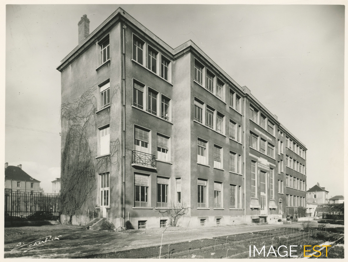 Bâtiment et jardin botanique de l'Ensaia (École nationale supérieure d'agronomie et des industries alimentaires) rue Sainte-Catherine à Nancy (Meurthe-et-Moselle). L'histoire de cette institution remonte à la création successive de trois grandes écoles, l'École de brasserie et de malterie de Nancy (1893), l'Institut colonial et agricole de Nancy (1901) et l'École de laiterie de Nancy (1905). En 1948, l'Institut colonial et agricole de Nancy devient l'École nationale supérieure d'agronomie de Nancy (ENSA). En 1971, les trois grandes écoles (École de brasserie, École de laiterie et Ensa) fusionnent et donnent naissance à l'Ensaia. C'est en 1984 que l'Ensaia quitte ses locaux de la rue Sainte-Catherine à Nancy pour s'installer sur le plateau de Brabois (Source : https://ensaia.univ-lorraine.fr/fr/content/histoire-ensaia). Cachet du photographe nancéien Jean Scherbeck au verso.