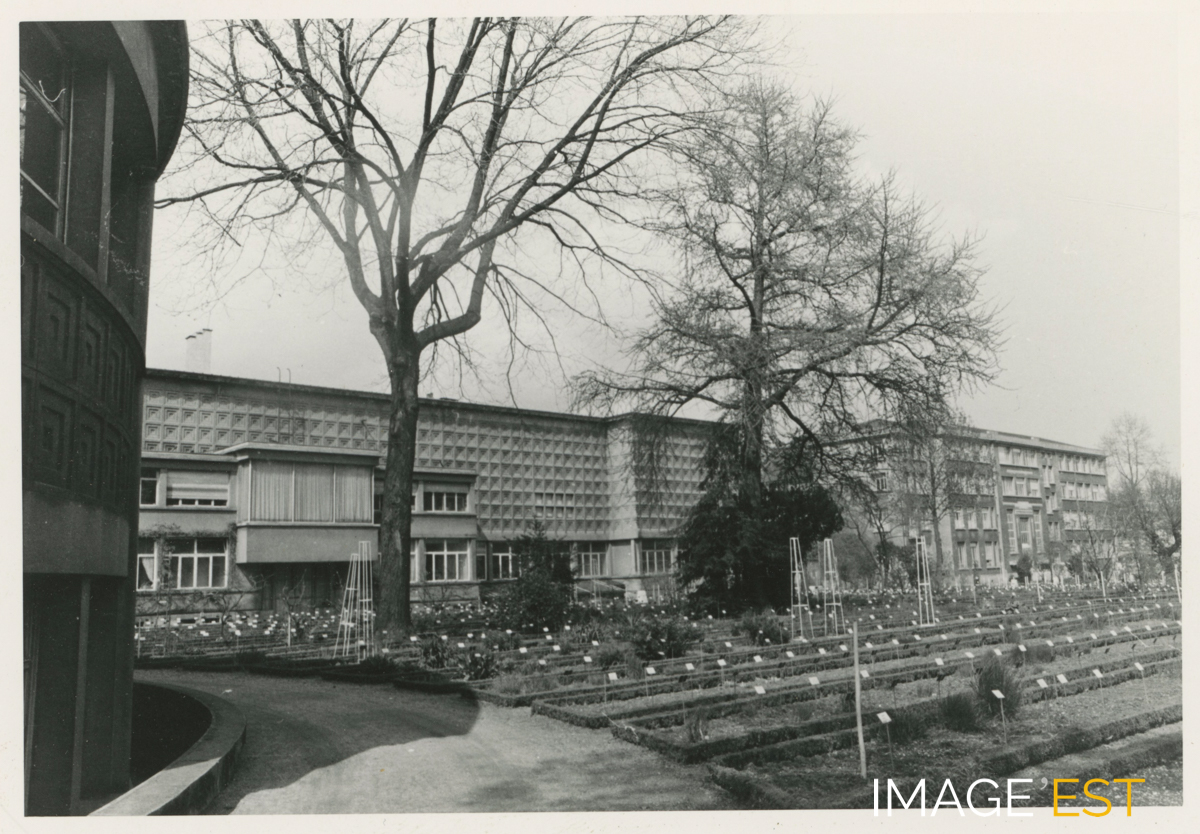 Bâtiments et jardin de l'Ensaia (École nationale supérieure d'agronomie et des industries alimentaires) rue Sainte-Catherine à Nancy (Meurthe-et-Moselle). L'histoire de cette institution remonte à la création successive de trois grandes écoles, l'École de brasserie et de malterie de Nancy (1893), l'Institut colonial et agricole de Nancy (1901) et l'École de laiterie de Nancy (1905). En 1948, l'Institut colonial et agricole de Nancy devient l'École nationale supérieure d'agronomie de Nancy (ENSA). En 1971, les trois grandes écoles (École de brasserie, École de laiterie et Ensa) fusionnent et donnent naissance à l'Ensaia. C'est en 1984 que l'Ensaia quitte ses locaux de la rue Sainte-Catherine à Nancy pour s'installer sur le plateau de Brabois (Source : https://ensaia.univ-lorraine.fr/fr/content/histoire-ensaia). Cette vue, prise le 24 avril 1972 (date au verso) montre le jardin Dominique Alexandre Godron et l'arrière des bâtiments de l'actuel Musée-Aquarium.
