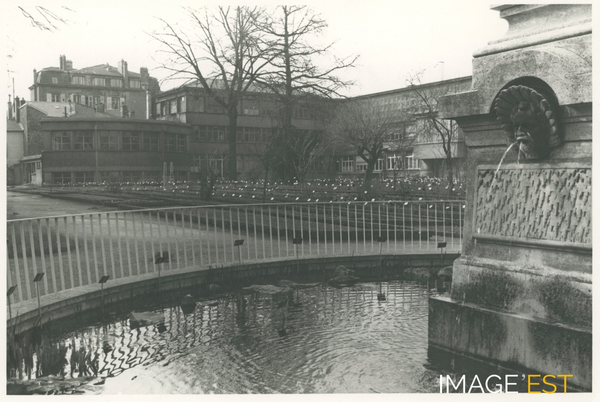 Bâtiments et jardin de l'Ensaia (École nationale supérieure d'agronomie et des industries alimentaires) rue Sainte-Catherine à Nancy (Meurthe-et-Moselle). L'histoire de cette institution remonte à la création successive de trois grandes écoles, l'École de brasserie et de malterie de Nancy (1893), l'Institut colonial et agricole de Nancy (1901) et l'École de laiterie de Nancy (1905). En 1948, l'Institut colonial et agricole de Nancy devient l'École nationale supérieure d'agronomie de Nancy (ENSA). En 1971, les trois grandes écoles (École de brasserie, École de laiterie et Ensa) fusionnent et donnent naissance à l'Ensaia. C'est en 1984 que l'Ensaia quitte ses locaux de la rue Sainte-Catherine à Nancy pour s'installer sur le plateau de Brabois (Source : https://ensaia.univ-lorraine.fr/fr/content/histoire-ensaia). Cette vue montre le Jardin Dominique Alexandre Godron et l'arrière des bâtiments de l'actuel Musée-Aquarium. Au premier plan, la fontaine du monument dédié à l'explorateur Jules Crevaux (1847-1882) et érigé au sommet d'une pyramide et d'une fontaine se déversant dans un bassin. Quatre mascarons - on en voit un sur ce cliché - représentent chacun un type d'Amérindiens d'Amazonie étudié par Jules Crevaux.
