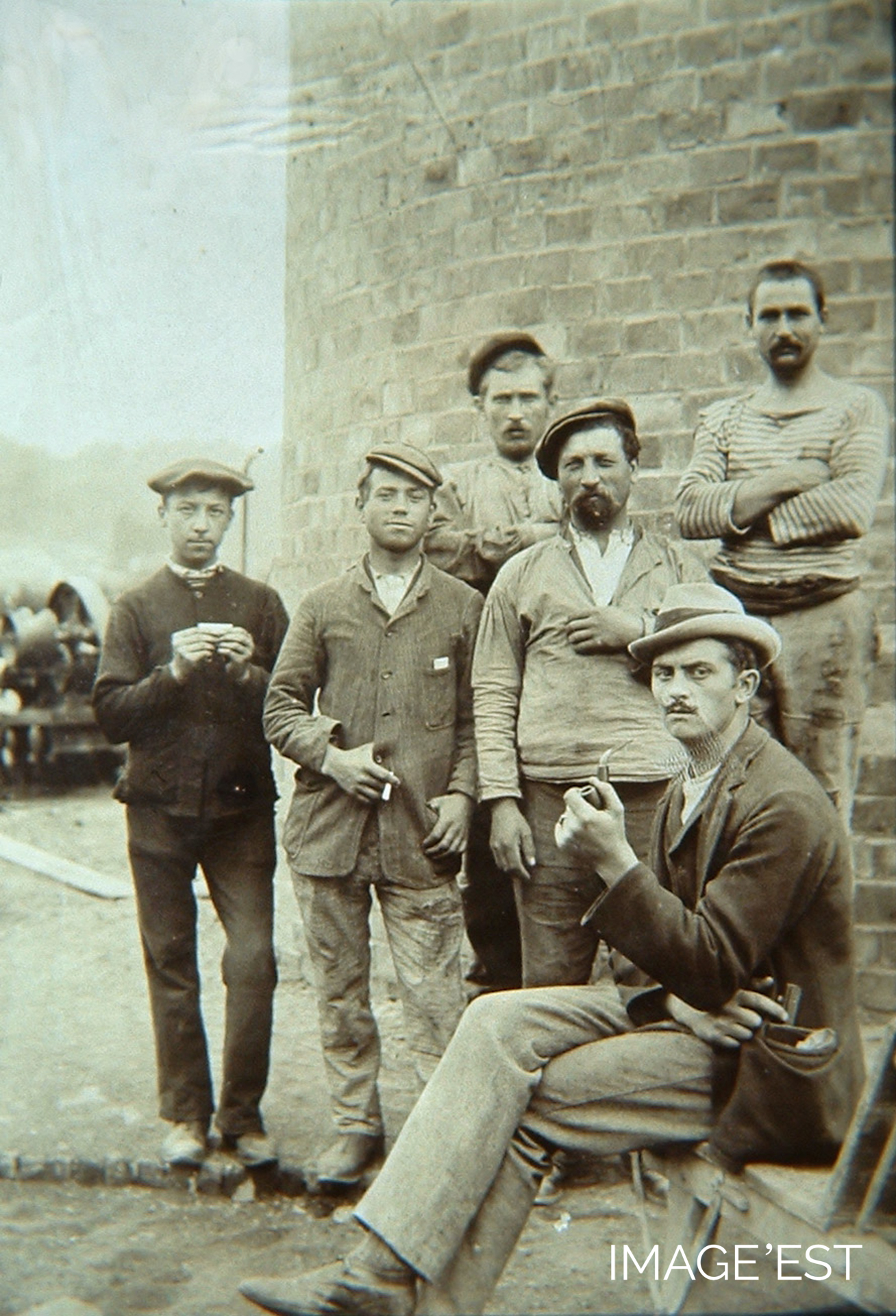 Bâtisseurs de cheminées faisant une pause à l'usine de la Providence de Réhon (Meurthe-et-Moselle) en 1899. Ces hommes travaillent pour l'entreprise Ferbeck basée Aix-la-Chapelle (Belgique), spécialisée dans ce type de construction.