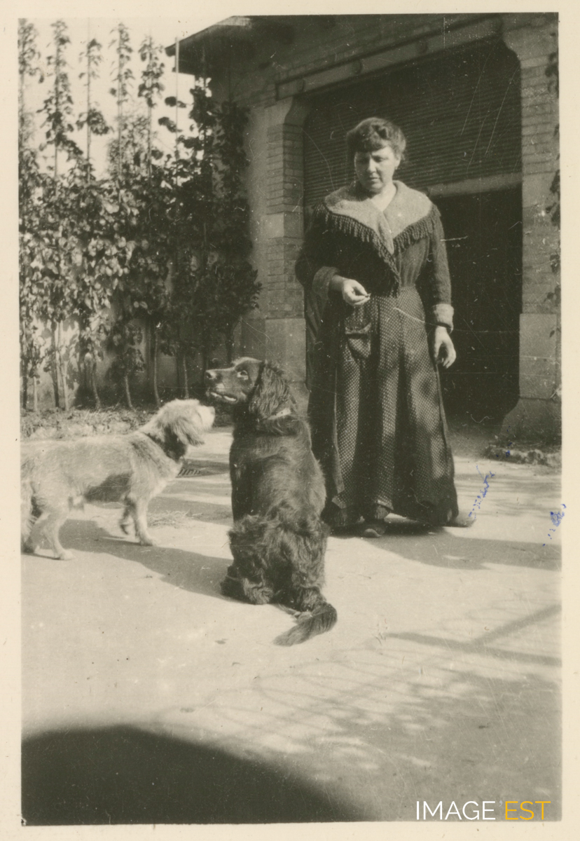 Berthe Kalis (1876-1947) et ses chiens devant le garage de sa maison au 5, avenue Georges Clemenceau à Nancy (Meurthe-et-Moselle). (Source : Archives privées des familles Kalis-Moreau).