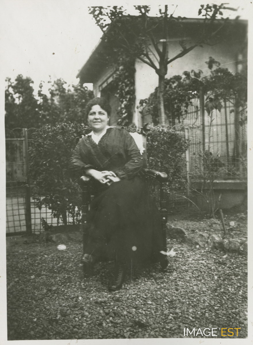 Berthe Kalis (1876-1947) assise dans son jardin au 5, avenue Georges Clemenceau à Nancy (Meurthe-et-Moselle). (Source : Archives privées des familles Kalis-Moreau).