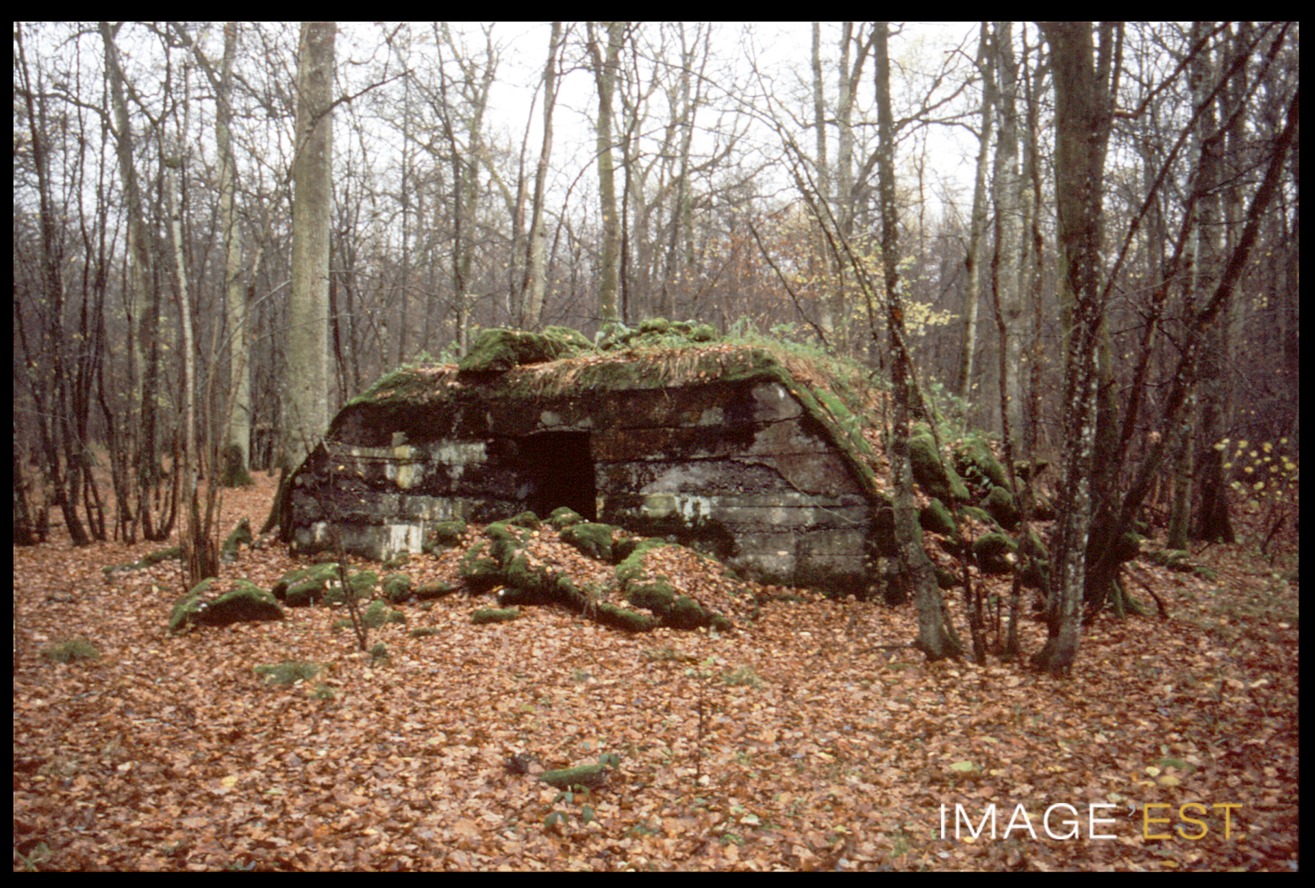 Blockhaus-abri à demi effondré en son centre au camp Marguerre dans la forêt communale de Gouraincourt (Meuse).