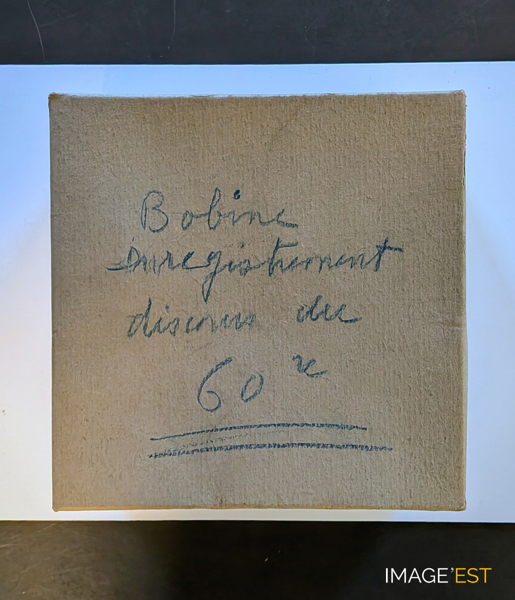 Petite boîte cartonnée (15,5 x 15,5 cm) sur laquelle figure l'inscription : " Bobine d'enregistrement discours du 60 re " conservée dans les collections de l'École nationale supérieure des industries chimiques (ENSIC) à Nancy (Meurthe-et-Moselle). Cette boîte contient une bobine sur laquelle est enroulé un fil d'acier qui comporte un enregistrement magnétique probablement du discours du 60e anniversaire de la création de l'Institut chimique de Nancy (1887-1947).