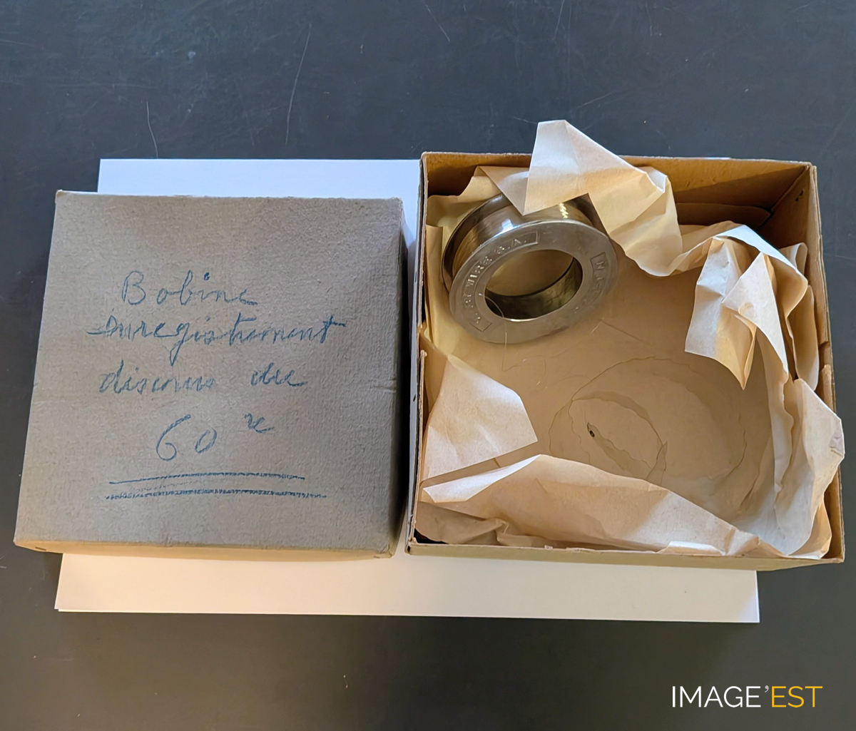 Petite boîte cartonnée (15,5 x 15,5 cm) sur laquelle figure l'inscription : " Bobine d'enregistrement discours du 60 re " conservée dans les collections de l'École nationale supérieure des industries chimiques (ENSIC) à Nancy (Meurthe-et-Moselle). Cette boîte contient une bobine sur laquelle est enroulé un fil d'acier qui comporte un enregistrement magnétique probablement du discours du 60e anniversaire de la création de l'Institut chimique de Nancy (1887-1947).