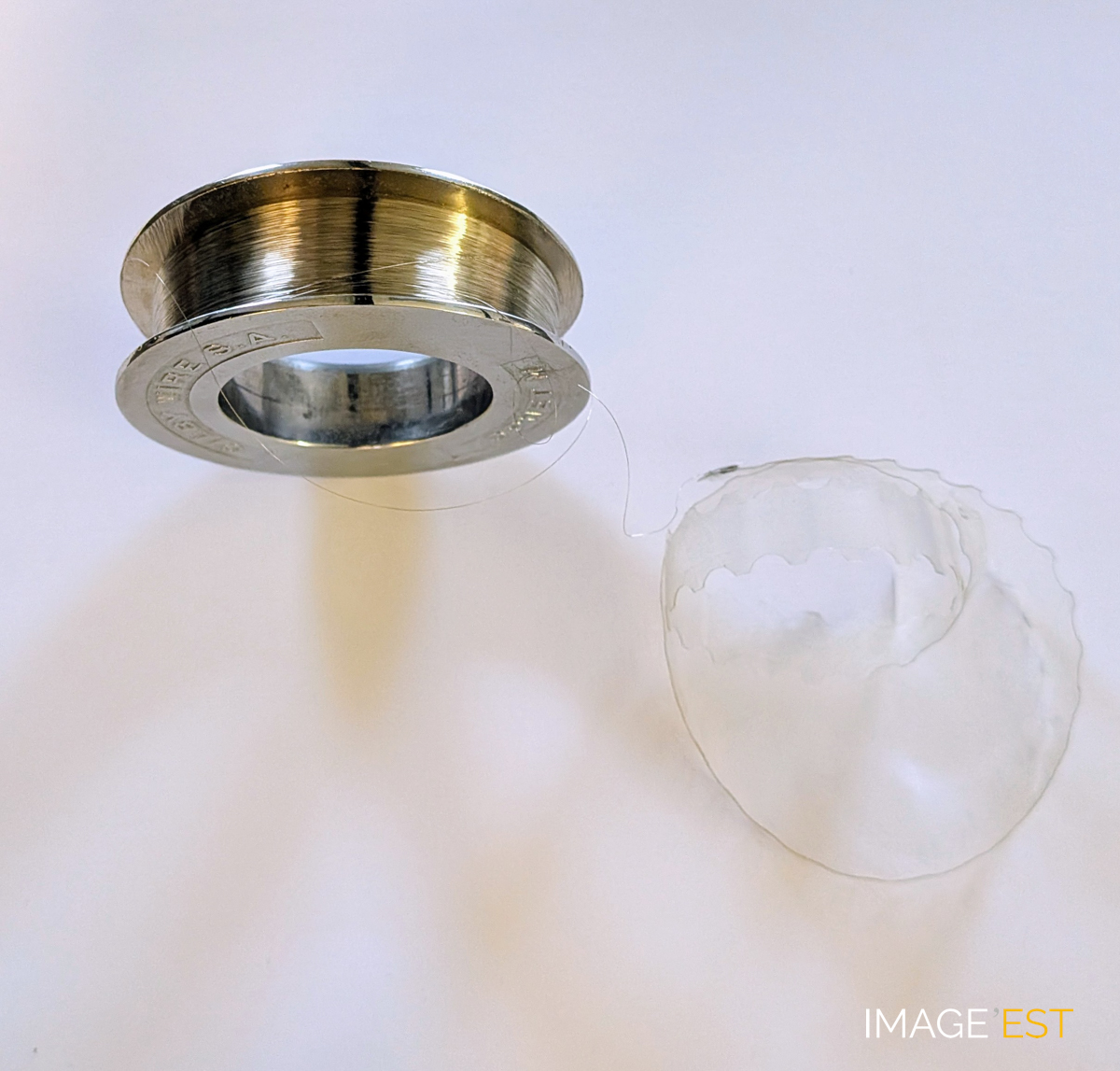 Bobine d'enregistrement (diamètre 7 cm) conservée dans les collections de l'École nationale supérieure des industries chimiques (ENSIC) à Nancy (Meurthe-et-Moselle) sur laquelle est enroulé un fil d'acier qui comporte un enregistrement magnétique probablement du discours du 60e anniversaire de la création de l'Institut chimique de Nancy (1887-1947).