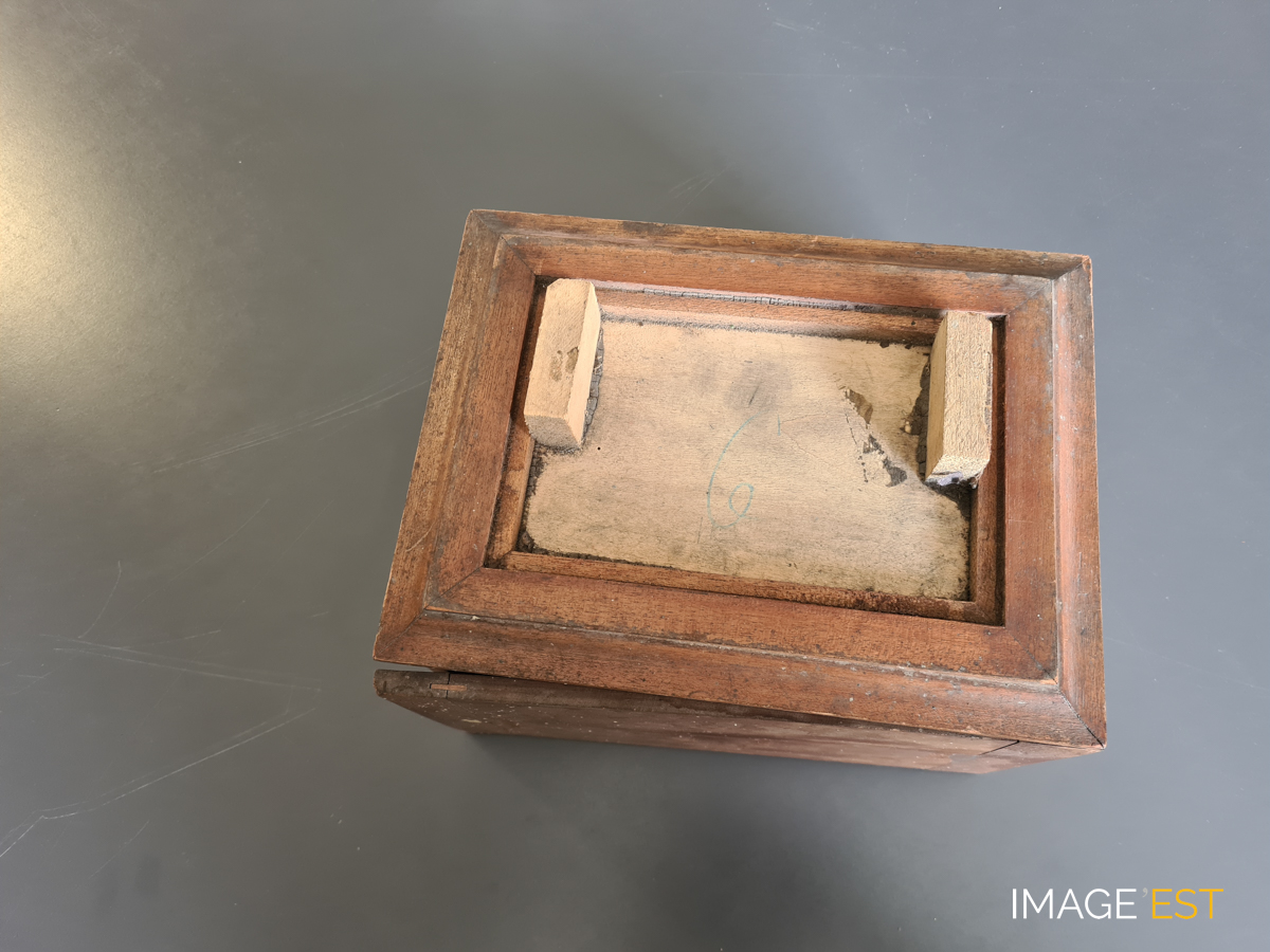Vue du dessus de la boîte de plaques de verre du Stéréoscope Educa, conçu par la société A. Mattey datant des années 1920. (Source : Nicolas Le Guern, « La stéréoscopie dans les salles de classe. Le cas du stéréoscope Educa dans la France de l'entre-deux-guerres », Transbordeur [En ligne], 8 | 2024, mis en ligne le 15 février 2025, consulté le 28 octobre 2025. URL : http://journals.openedition.org/transbordeur/1456 ; DOI : https://doi.org/10.4000/12gy7). On observe les deux supports en bois du stéréoscope.