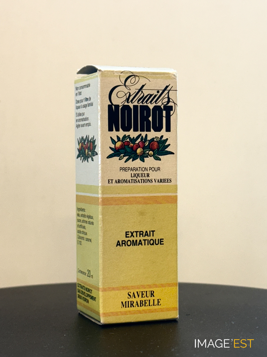 Boîte en carton contenant une mignonette d'Extraits Noirot au parfum de mirabelle. Cette préparation pour liqueur et aromatisations variées a été inventée par Théodule Noirot (1863-1948), botaniste, distillateur et fabriquée au sein de l'usine implantée 18, rue des Fabriques à Nancy (Meurthe-et-Moselle). Une notice explicative d'utilisation était fournie avec chaque flacon.