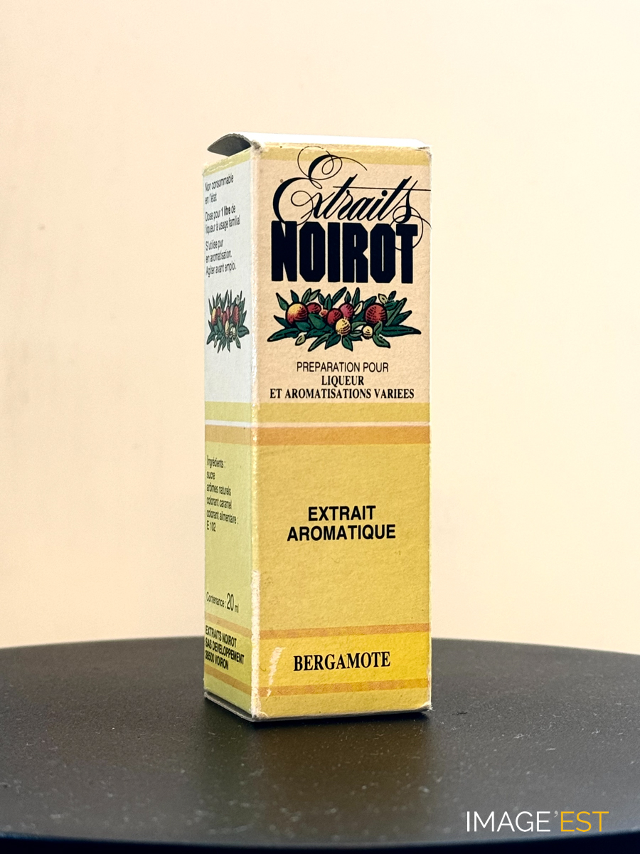 Boîte en carton contenant une mignonette d'Extraits Noirot au parfum bergamote. Cette préparation pour liqueur et aromatisations variées a été inventée par Théodule Noirot (1863-1948), botaniste, distillateur et fabriquée au sein de l'usine implantée 18, rue des Fabriques à Nancy (Meurthe-et-Moselle). Une notice explicative d'utilisation était fournie avec chaque flacon.