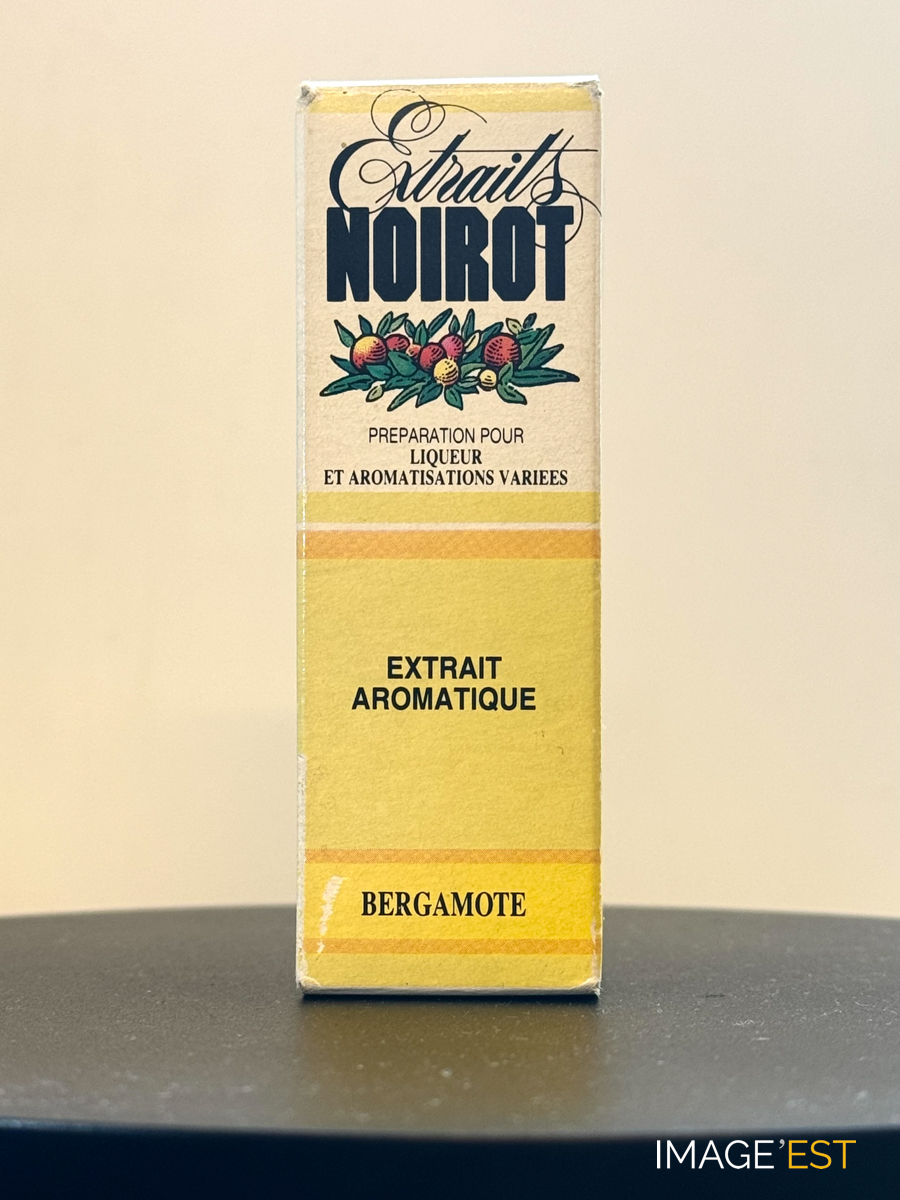 Boîte en carton contenant une mignonette d'Extraits Noirot au parfum bergamote. Cette préparation pour liqueur et aromatisations variées a été inventée par Théodule Noirot (1863-1948), botaniste, distillateur et fabriquée au sein de l'usine implantée 18, rue des Fabriques à Nancy (Meurthe-et-Moselle). Une notice explicative d'utilisation était fournie avec chaque flacon.