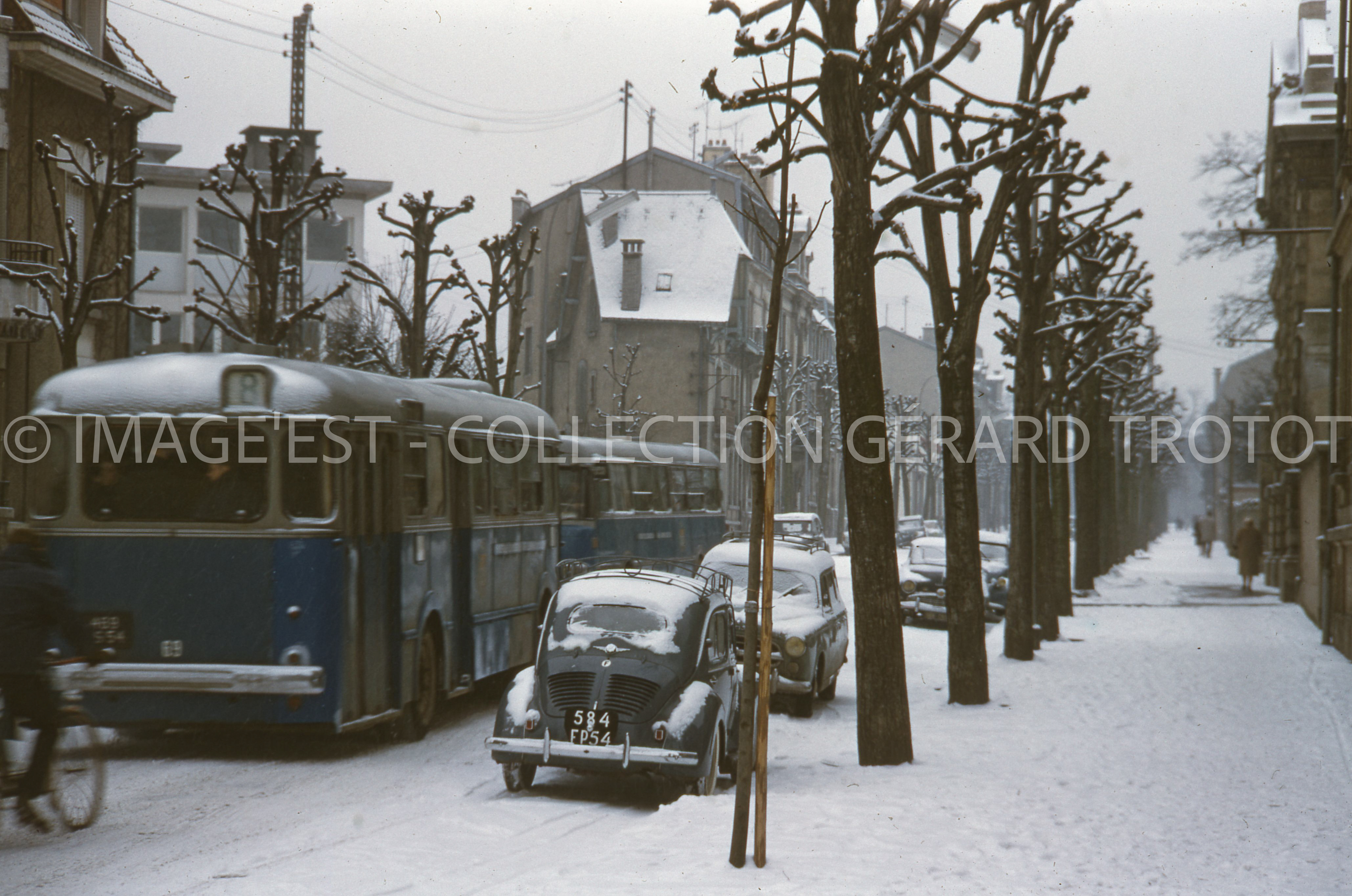 Autobus à l'intersection de la rue Henri Deglin et du boulevard Charles V à Nancy (Meurthe-et-Moselle) en février 1962.
