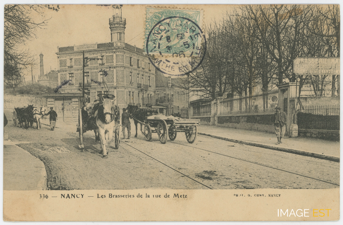 Trois attelages rue de Metz à Maxéville (Meurthe-et-Moselle). À l'arrière-plan, la tour Betting de la Brasserie de Maxéville, à droite, la brasserie Martinot qui deviendra plus tard le Trianon.