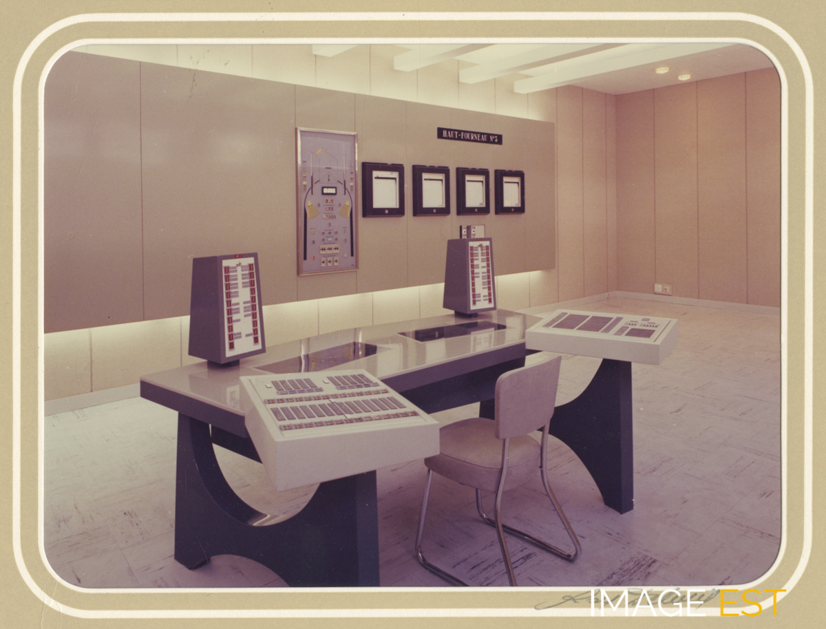 Bureau de commande de la " Société des hauts-fourneaux et fonderies de Pont-à-Mousson " à Pont-à-Mousson (Meurthe et Moselle). Le nom du photographe est noté au crayon en bas à droite : Ray Delvert (1914-1992). Au verso, le cachet " Photo Ray Delvert " - 47- Villeneuve-s-Lot - tél.600 Cliché n° E - 5 ".