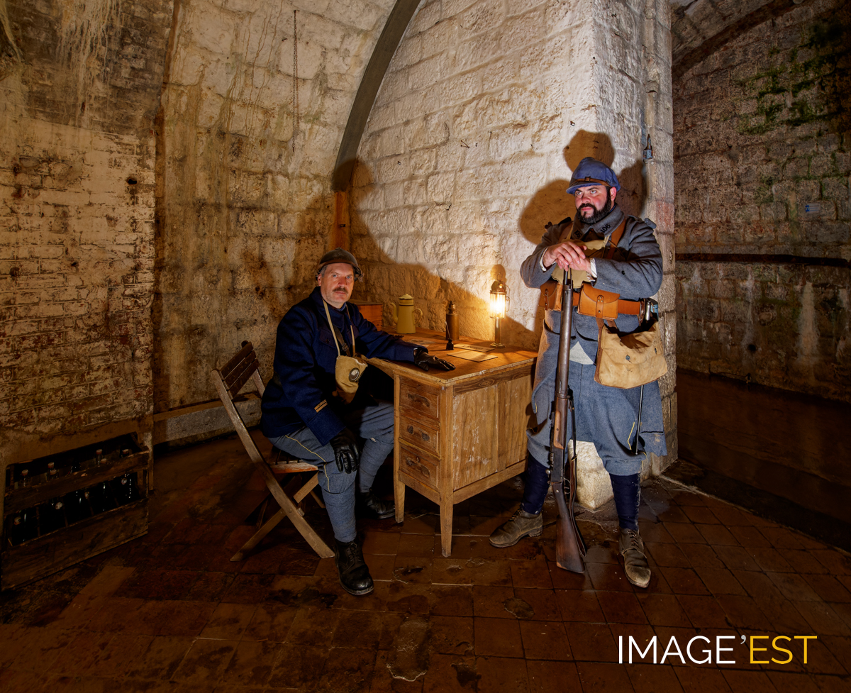 Bureau de contrôle à l'intérieur du fort de Regret à Verdun (Meuse). Cette photographie a été prise le 5 octobre 2024 dans le cadre de la Nuit des forts de Vaux organise?e par le Me?morial de Verdun, faisant partie de l'association " Les Poilus de la Marne ". Les militaires portent au cou un masque à gaz.