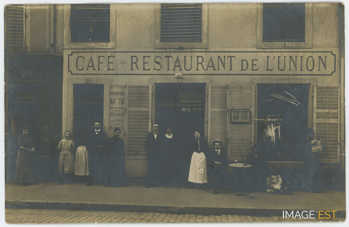 Groupe de personnes devant le café-restaurant de l'Union. Au verso, une annotation illisible de la main d'un enfant.
