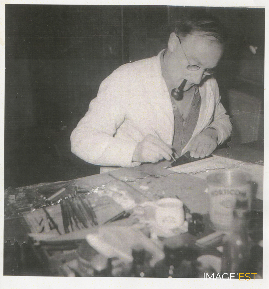Camille Naumann (1897-1974), graveur et dessinateur publicitaire, à sa table de travail, avenue Patton à Maxéville (Meurthe-et-Moselle).