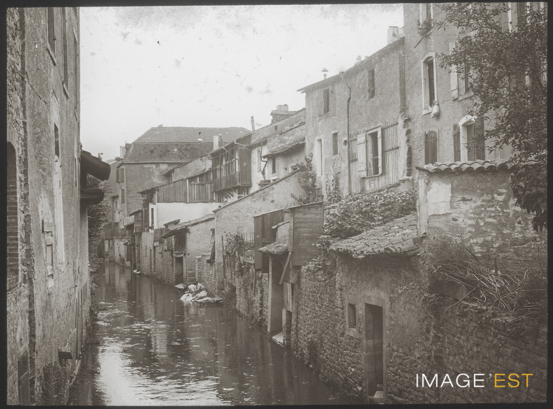 Habitations autour du canal à Mirecourt (Vosges). Une mention manuscrite en marge de la plaque de verre indique : " Mirecourt. Sur le canal. "