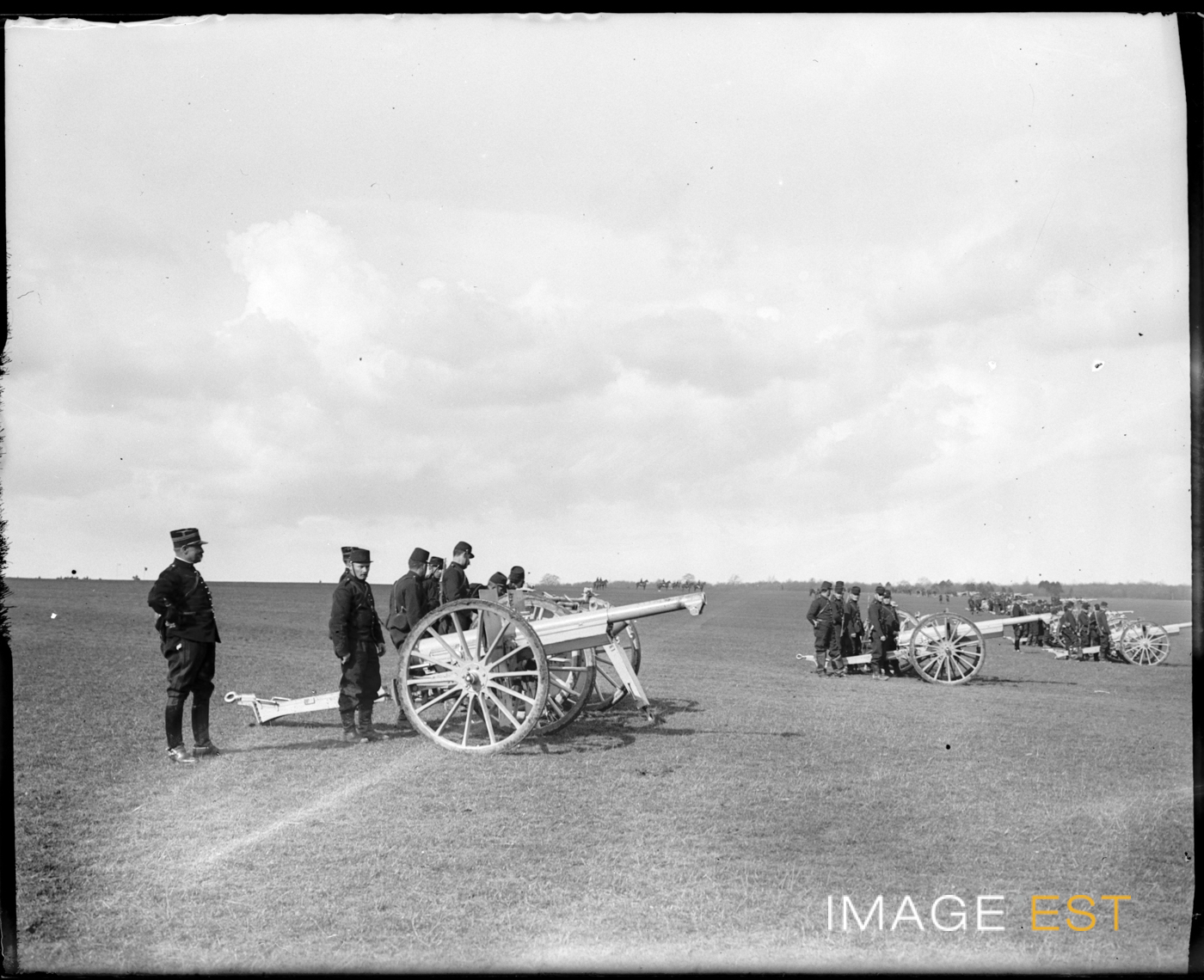 Tirs de canons de 155mm en batterie lors de manoeuvres au plateau de Malzéville (Meurthe-et-Moselle).