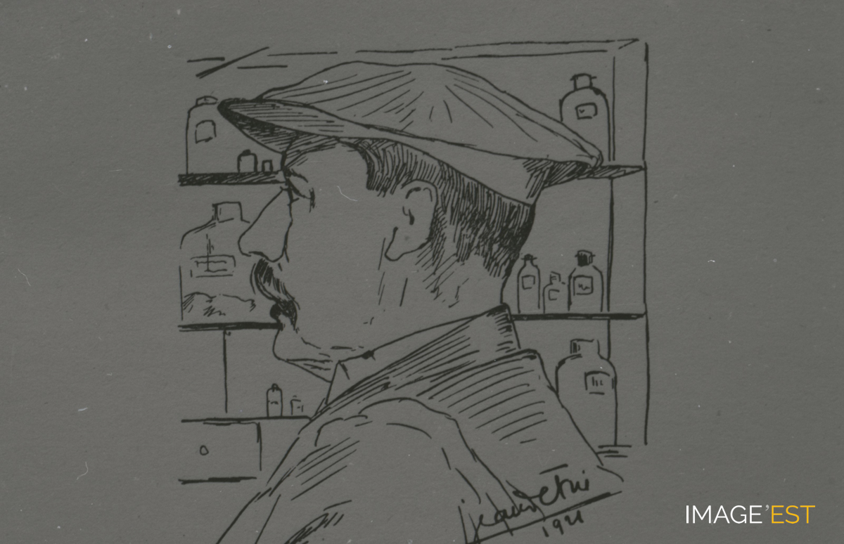 Caricature d'une personnalité non identifiée de l'Institut chimique de Nancy (Meurthe-et-Moselle).