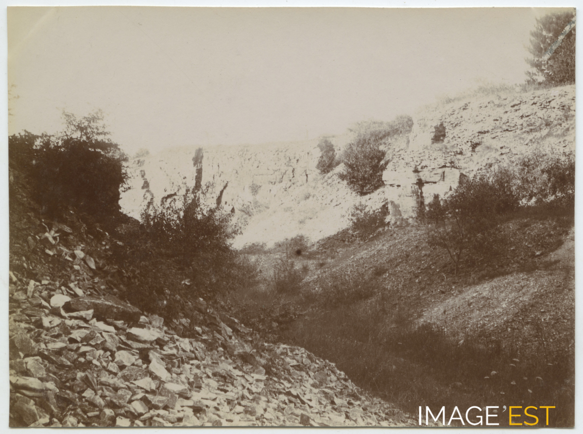 Site des carrières des Quatre Vents à Laxou (Meurthe-et-Moselle) en mars 1898. Une mention manuscrite au verso de cette photographie précise : " N° 217 (102) - Les carrières des 4 Vents, à Laxou - face tournée vers l'Est. 3 - 98 ".