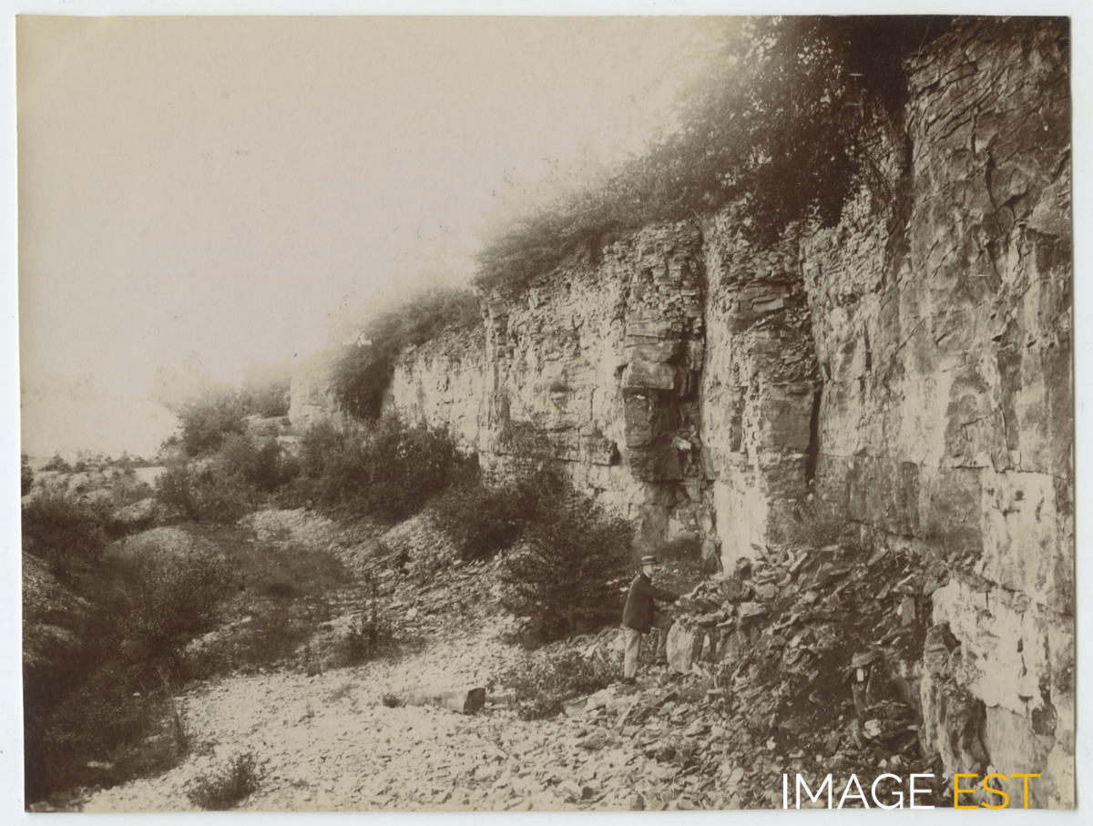 Site des carrières des Quatre Vents à Laxou (Meurthe-et-Moselle) en mars 1898. Une mention manuscrite au verso de cette photographie précise : " N° 218 (102) - Les carrières des 4 Vents, à Laxou - face tournée vers l'Ouest. 3 - 98 ". À remarquer la présence d'une personne au pied de la falaise.