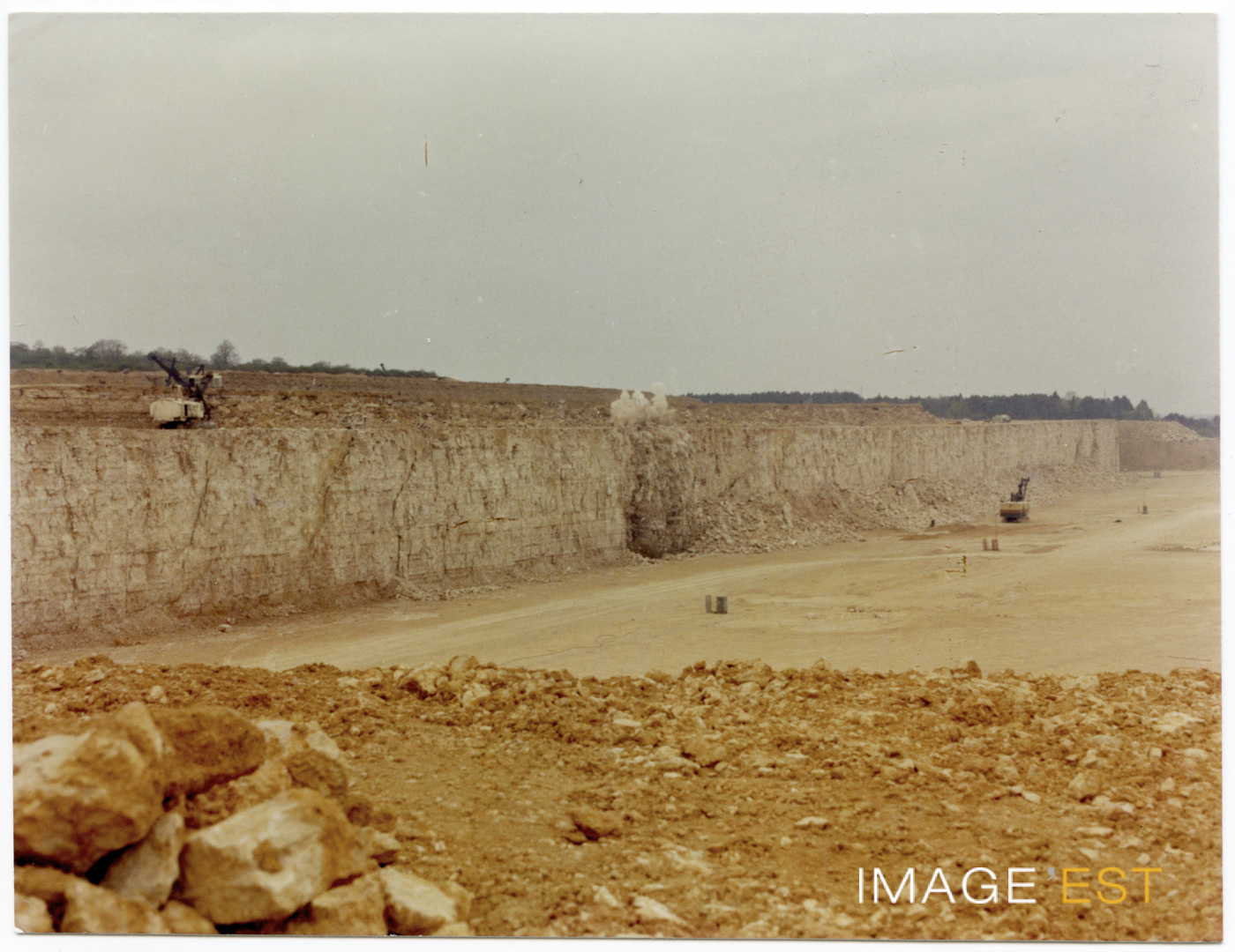 Vue sur le front de taille aux carrières Solvay à Maxéville (Meurthe-et-Moselle). Au premier plan du calcaire réduit en morceaux, à l'arrière-plan, un tir d'abattage.