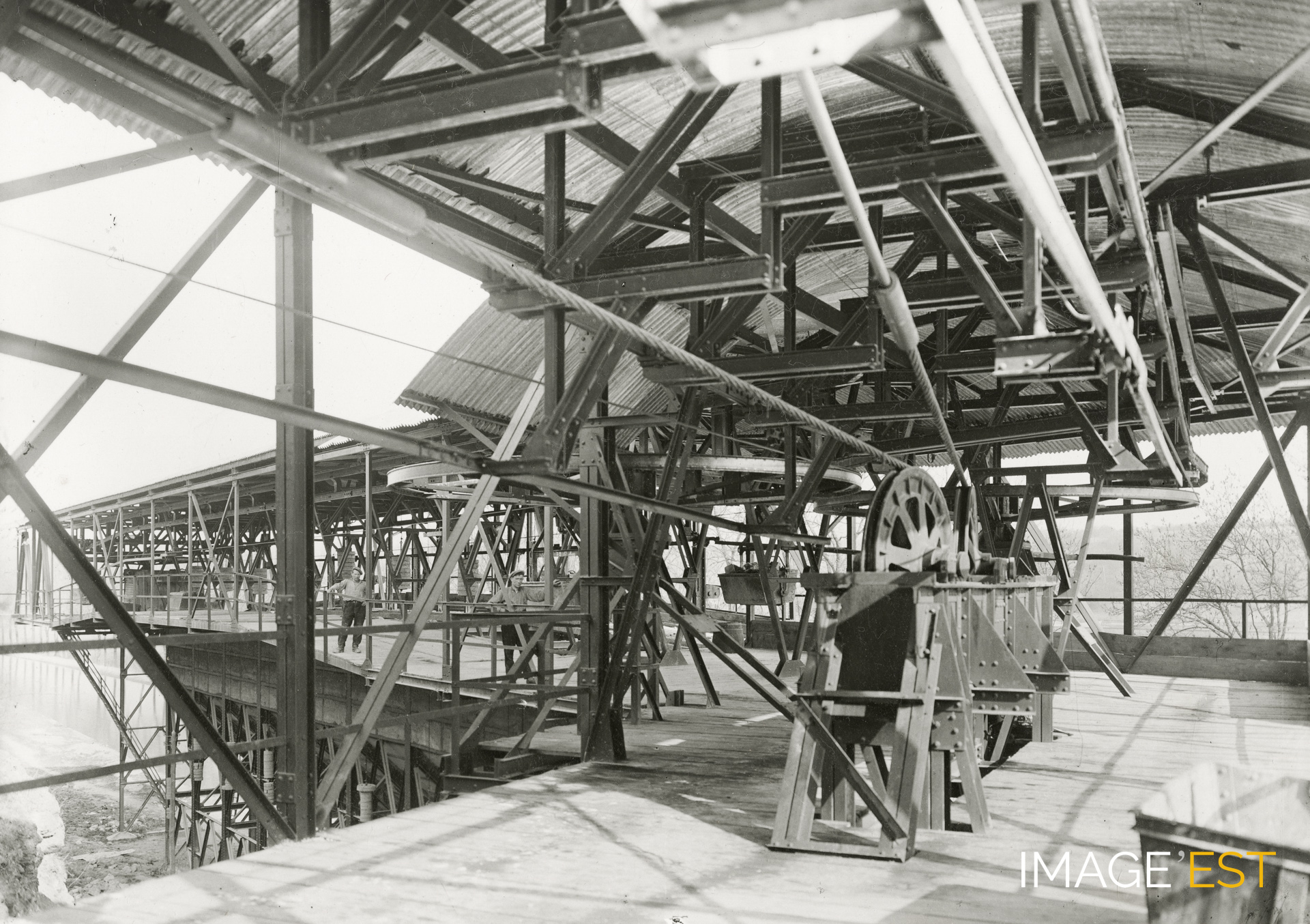 Carrières de Villey-Saint-Étienne (Meurthe-et-Moselle). Cette photoghaphie contrecollée sur un carton est extraite de l'album Marcheville Daguin et Cie : Société du comptoir du sel et des produits chimiques de l'Est. Soudière de La Madeleine. Carrière de Villey-Saint-Etienne. Une légende dactylographiée en marge de cette photographie précise : " Carrières de Villey-Saint-Étienne (Station de chargement au canal) ".