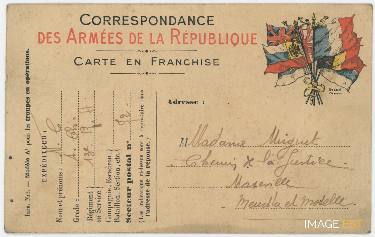 Carte de correspondance (Modèle A1) des armées de la République ornée d'un bouquet de drapeaux illustré par " Stern graveur ".
