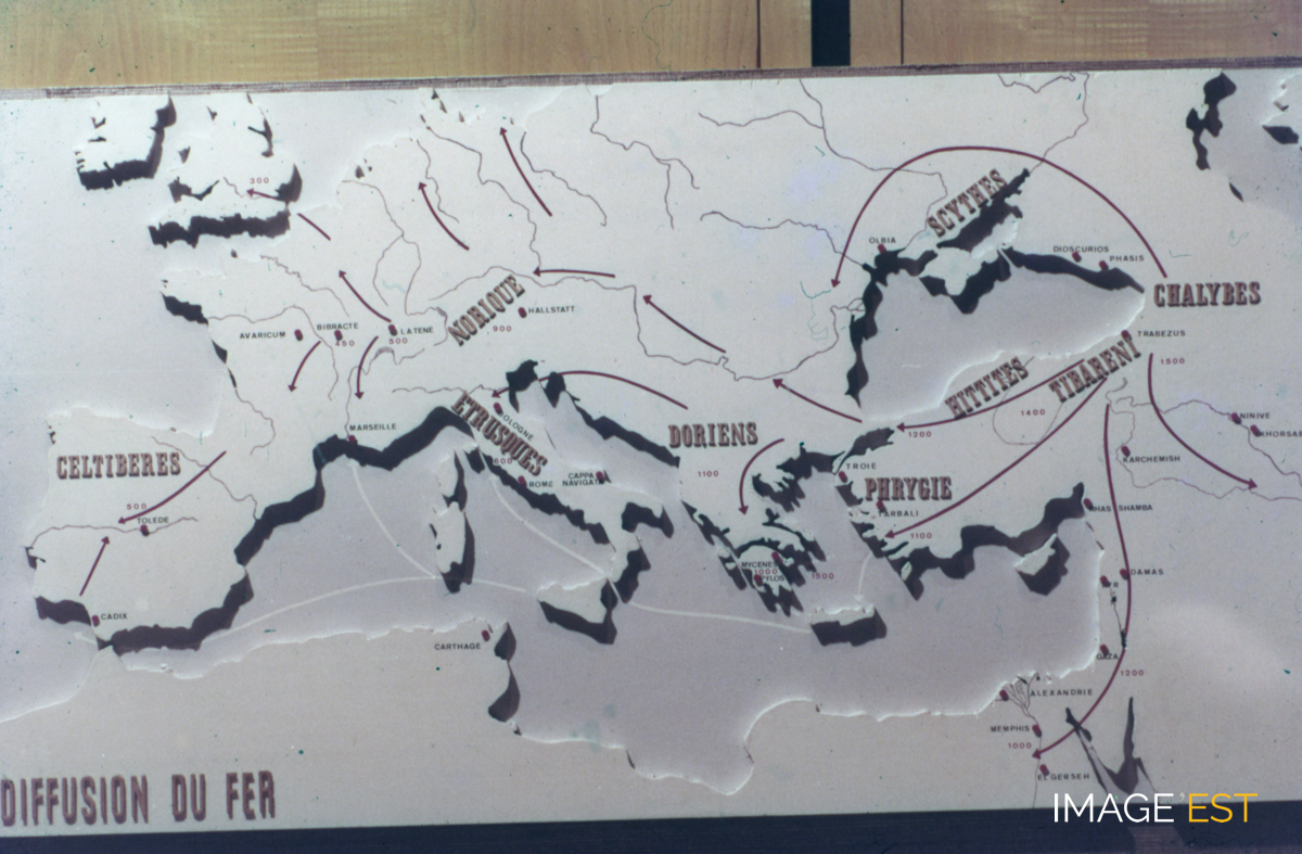 Carte du Musée de l'histoire du fer à Jarville-la-Malgrange (Meurthe-et-Moselle) illustrant l'apparition et la diffusion du fer dans l'Antiquité. En marge de la diapositive figure la mention : " 6. Dates de l'apparition de l'industrie du fer en Europe ".