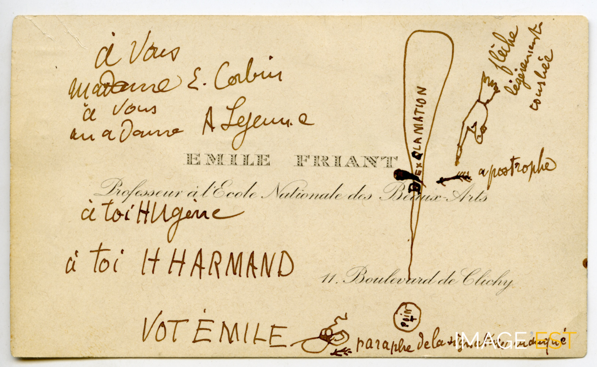 Carte de visite au nom d'Émile Friant (1863-1932), professeur à l'École nationale des Beaux-Arts, comportant une annotation manuscrite adressée aux épouses d'Eugène Corbin et d'Armand Lejeune. Elle présente au verso (voir FI-0800-0007) une caricature, par Friant lui-même, de son tableau « Les Canotiers de la Meurthe » (1888, Musée de l'Ecole de Nancy) intitulée : « Les canotières de bons contours ».