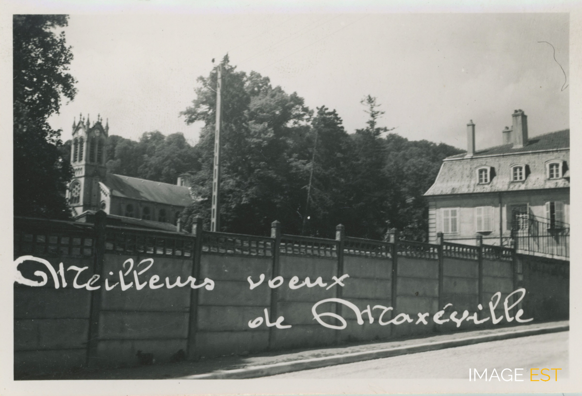 Une carte de voeux représentant l'église et la mairie vue de la rue Charcot à Maxéville (Meurthe-et-Moselle).