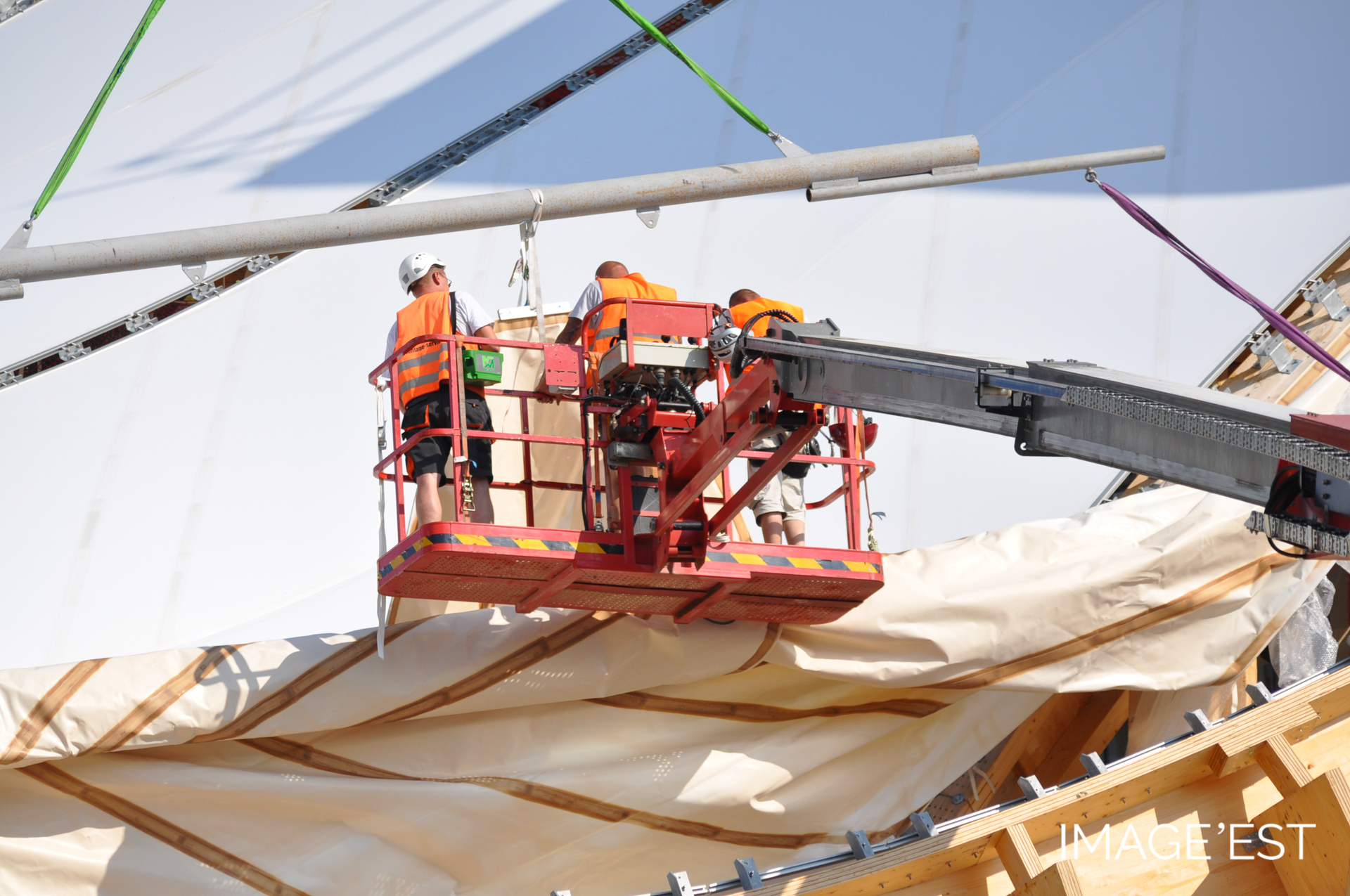 Pose d'une toile en fibre de verre au Centre Pompidou-Metz à Metz (Moselle).