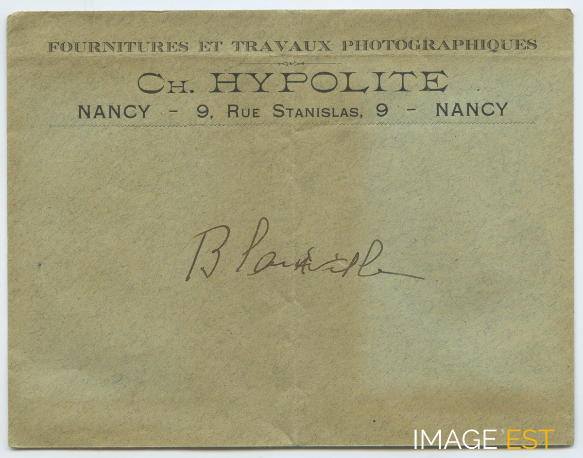 Enveloppe à l'en-tête des Établissements photographiques " Ch. Hypolite ", installés 9, rue Stanislas à Nancy (Meurthe-et-Moselle).