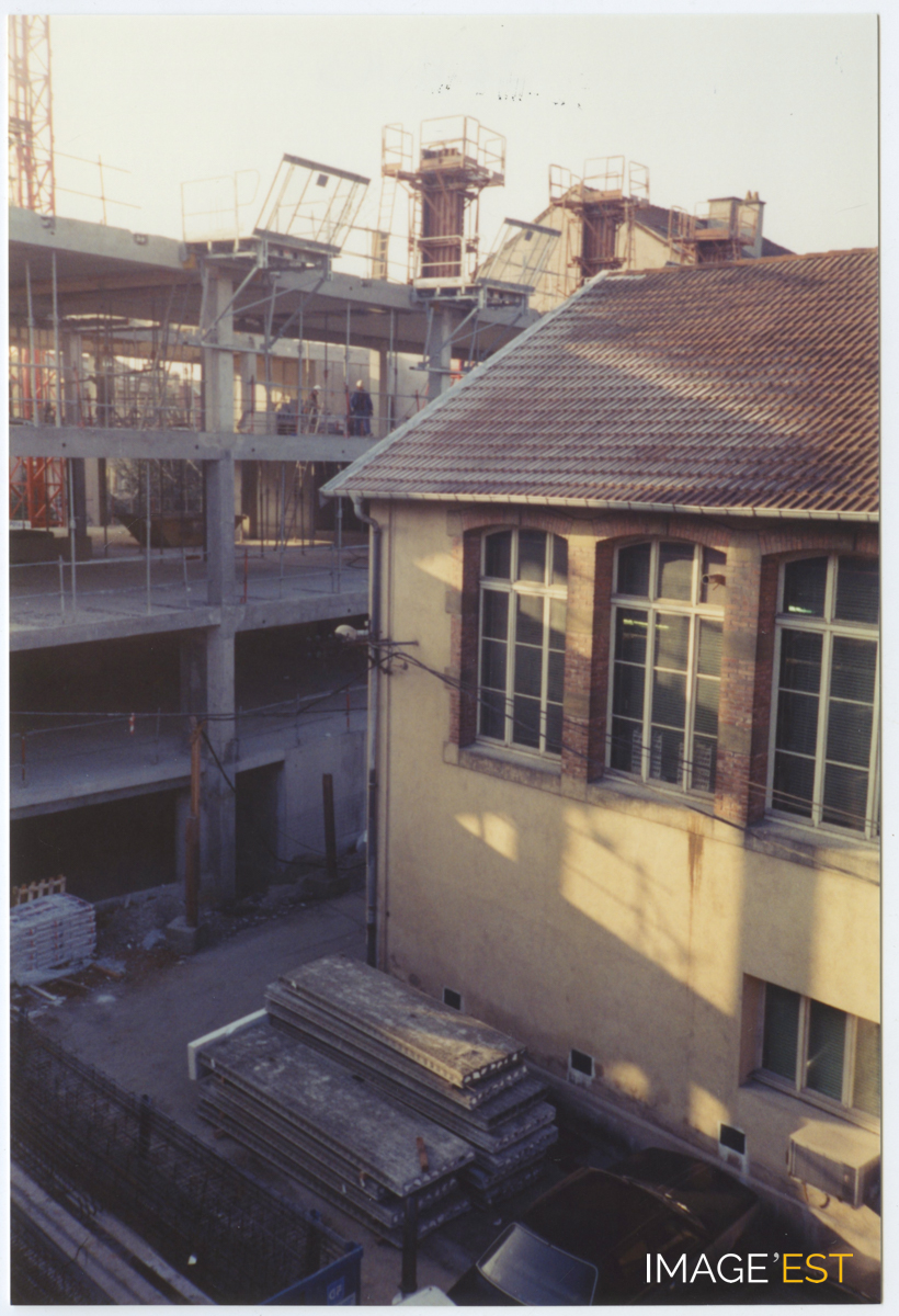Chantier de construction d'un nouveau bâtiment (Halle de biologie) de l'École nationale supérieure des industries chimiques (ENSIC) à Nancy (Meurthe-et-Moselle) le 26 novembre 1993.