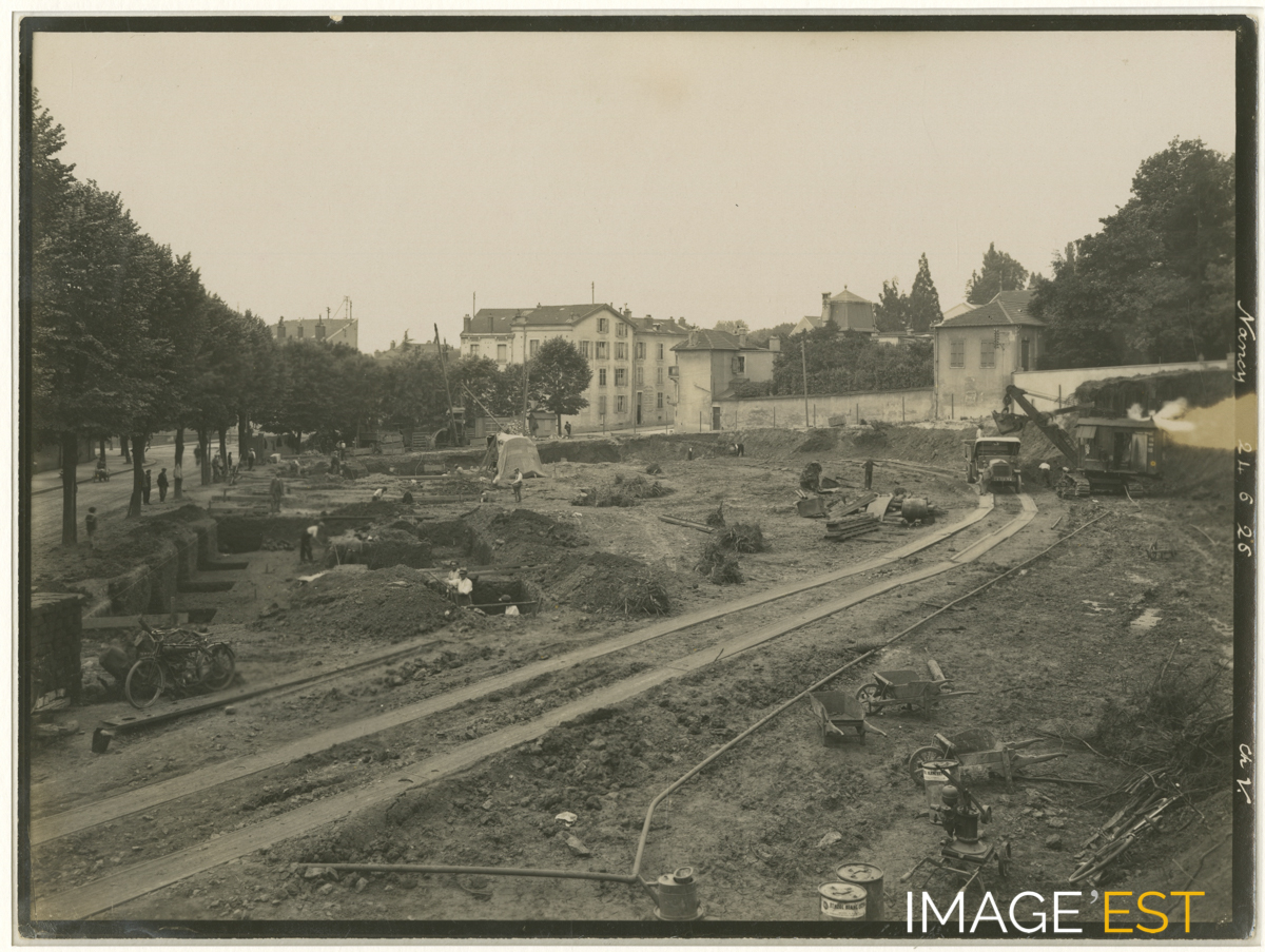 Ouvriers photographiés le 24 juin 1926 sur le chantier de construction des fondations de l'ancien siège de la " Société des hauts-fourneaux et fonderies de Pont-à-Mousson " au 91, avenue de la Libération à Nancy (Meurthe et Moselle) sur les plans de l'architecte Jean Bourgon (1895-1959). En marge de la photographie à droite figurent les mentions : " Nancy 24.6.26 - Ch. V ". Il s'agit du photographe Charles Vagné. Le chantier, commencé à l'été 1926, s'achèvera en 1928. Il se situe à l'angle de la rue de Toul (future avenue de la Libération), bordée d'arbres, et de la rue de la Foucotte. On y distingue le mur d'enceinte d'une propriété qui deviendra le théâtre de la Foucotte.