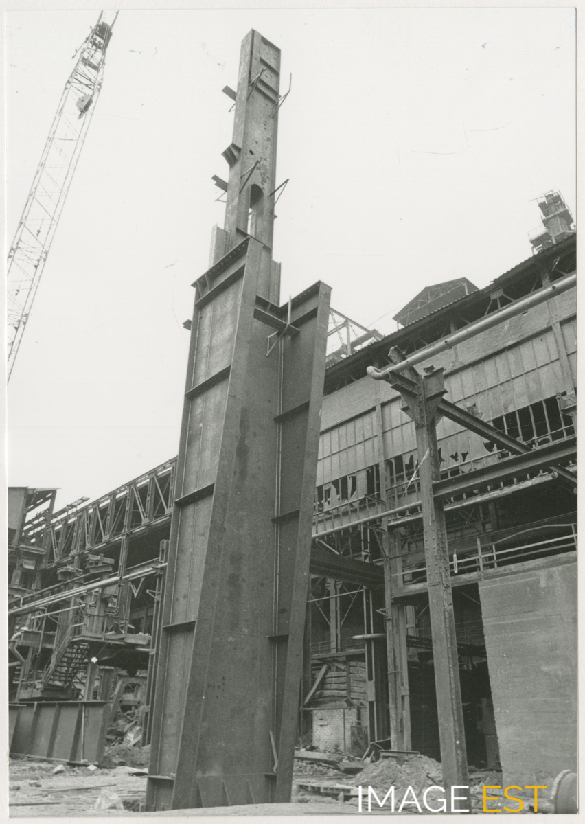 Chantier de démolition d'un bâtiment industriel de l'usine de Pont-à-Mousson (Meurthe et Moselle) le 9 mars 1974.