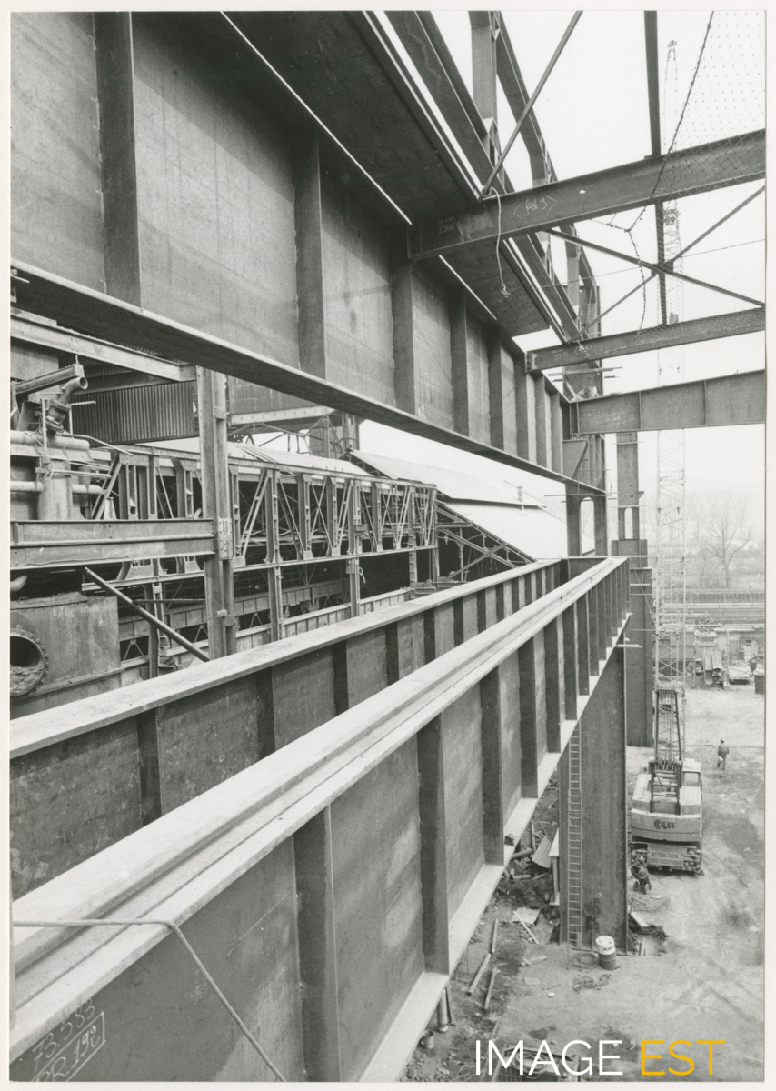 Chantier de démolition d'un bâtiment industriel de l'usine de Pont-à-Mousson (Meurthe et Moselle) le 9 mars 1974.