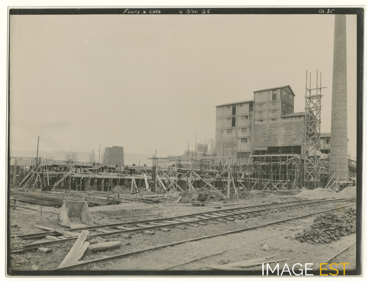 Chantier de construction de fours à coke de la " Société des hauts-fourneaux et fonderies de Pont-à-Mousson " à Pont-à-Mousson (Meurthe et Moselle) photographié le 4 novembre 1926. En marge de la photographie en haut figurent les mentions : " Fours à coke 4 Nov. 26 - Ch. V. ". Il s'agit du photographe Charles Vagné.