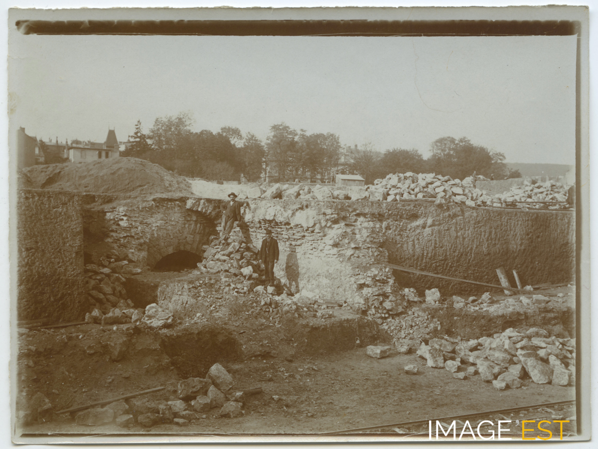 Chantier de démolition à Nancy (Meurthe-et-Moselle), le 20 août 1906. Une mention manuscrite au verso de cette photographie précise : " 777 - 20 8 1906 - Entrée du souterrain - 37 ". Une version plus claire de la photographie existe, avec une mention manuscrite : " 20 8 1906 - 35 ". Vue de rails et d'un souterrain.