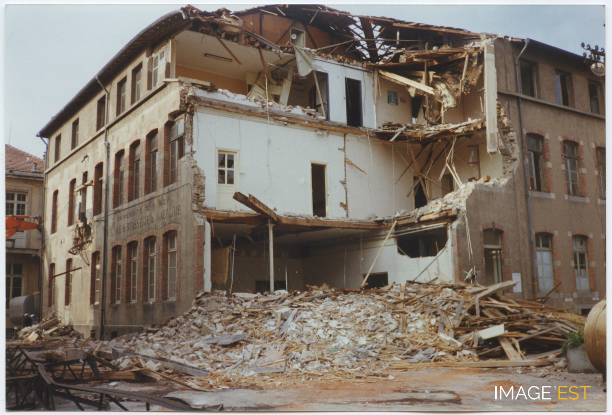Chantier de démolition de l'ancienne École de brasserie et de malterie de l'École nationale supérieure des industries chimiques (ENSIC) à Nancy (Meurthe-et-Moselle). On remarquera la dénomination de l'établissement figurant sur une façade du bâtiment.