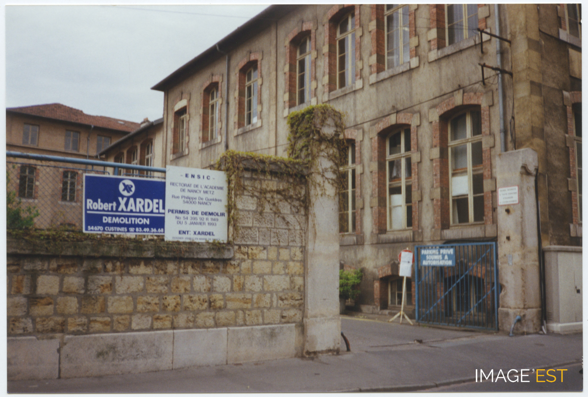 Chantier de démolition de l'ancienne École de brasserie et de malterie de l'École nationale supérieure des industries chimiques (ENSIC) à Nancy (Meurthe-et-Moselle). À remarquer la date d'obtention du permis de construire du 5 janvier 1993.