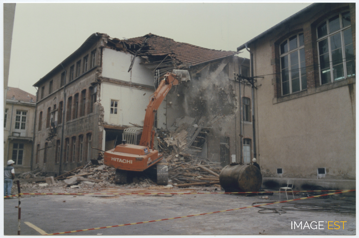 Chantier de démolition de l'ancienne École de brasserie et de malterie de l'École nationale supérieure des industries chimiques (ENSIC) à Nancy (Meurthe-et-Moselle).