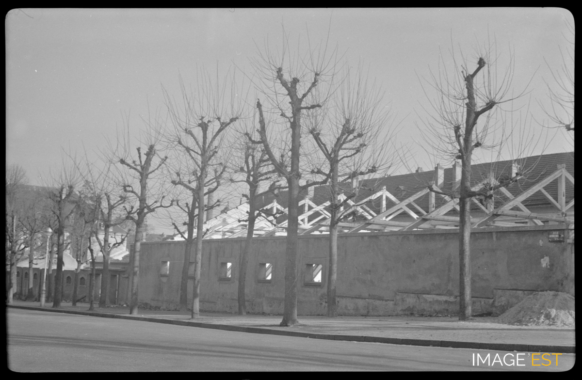 Chantier de destruction de l'ancien manège de la caserne Hugo rue Déglin à Nancy (Meurthe-et-Moselle). La production de cette photographie négative a été réalisée par la Maison H. Bellieni, Ritter & fils, successeurs installée 1, place Carnot à Nancy. Sur une pochette qui contenait ce négatif, figure le nom du destinaire de ce document : " M. Wahl " et une mention manuscrite : " Négatifs démolition (manège de la caserne Hugo) ". Le professeur Henri Wahl a été directeur de l'ENSIC. Un article de L'Est républicain du 24 février 1959 nous renseigne sur l'histoire de cet établissement. L'ancien manège de l'ex-caserne Hugo avait été désaffecté, puis reversé au domaine civil sur l'initiative du recteur Capelle pour servir de salle d'examens et de bal pour les étudiants. C'est en février 1959 que commençèrent les travaux de démolition pour la construction d'un nouveau bâtiment de l'École nationale supérieure des industries chimiques.