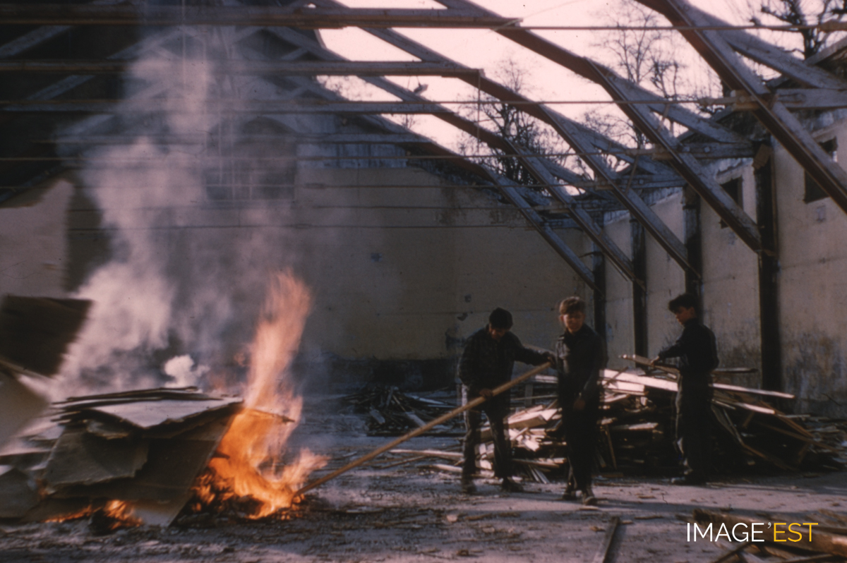Chantier de destruction de l'ancien manège de la caserne Hugo rue Déglin à Nancy (Meurthe-et-Moselle). Un article de L'Est républicain du 24 février 1959 nous renseigne sur l'histoire de cet établissement. L'ancien manège de l'ex-caserne Hugo avait été désaffecté, puis reversé au domaine civil sur l'initiative du recteur Capelle pour servir de salle d'examens et de bal pour les étudiants. C'est en février 1959 que commençèrent les travaux de démolition pour la construction d'un nouveau bâtiment de l'École nationale supérieure des industries chimiques.