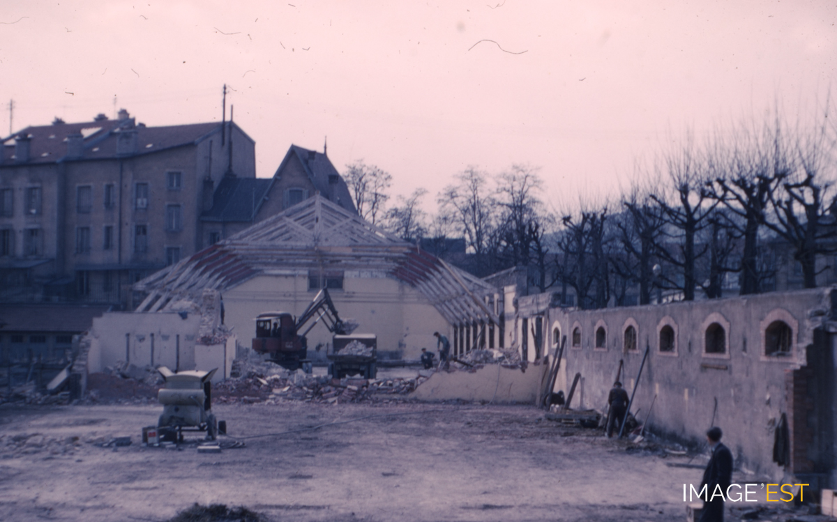 Chantier de destruction de l'ancien manège de la caserne Hugo rue Déglin à Nancy (Meurthe-et-Moselle). Un article de L'Est républicain du 24 février 1959 nous renseigne sur l'histoire de cet établissement. L'ancien manège de l'ex-caserne Hugo avait été désaffecté, puis reversé au domaine civil sur l'initiative du recteur Capelle pour servir de salle d'examens et de bal pour les étudiants. C'est en février 1959 que commençèrent les travaux de démolition pour la construction d'un nouveau bâtiment de l'École nationale supérieure des industries chimiques.