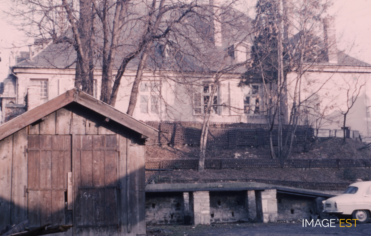 Chantier de destruction de l'ancien manège de la caserne Hugo rue Déglin à Nancy (Meurthe-et-Moselle). C'est en février 1959 que commençèrent les travaux de démolition pour la construction d'un nouveau bâtiment de l'École nationale supérieure des industries chimiques.