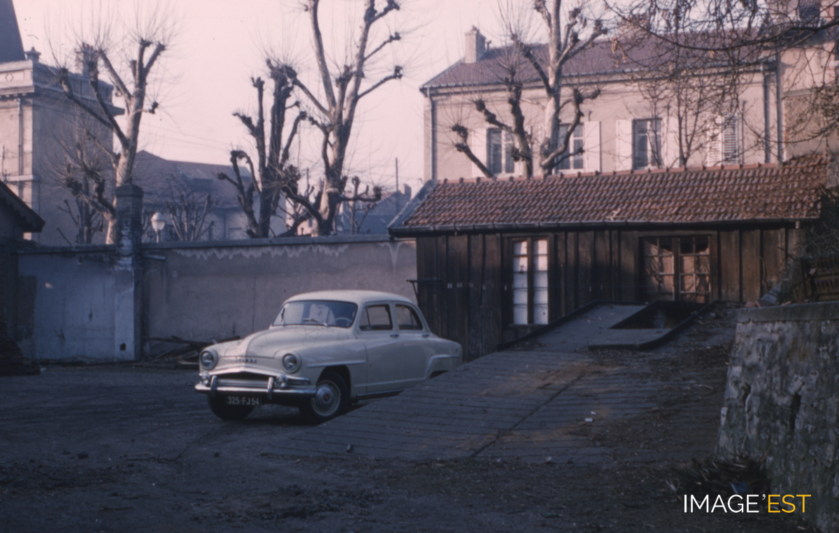 Chantier de destruction de l'ancien manège de la caserne Hugo rue Déglin à Nancy (Meurthe-et-Moselle). C'est en février 1959 que commençèrent les travaux de démolition pour la construction d'un nouveau bâtiment de l'École nationale supérieure des industries chimiques.
