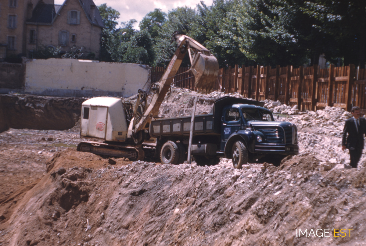 Chantier de destruction de l'ancien manège de la caserne Hugo rue Déglin à Nancy (Meurthe-et-Moselle). C'est en février 1959 que commençèrent les travaux de démolition pour la construction d'un nouveau bâtiment de l'École nationale supérieure des industries chimiques.